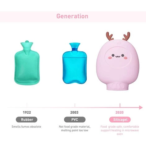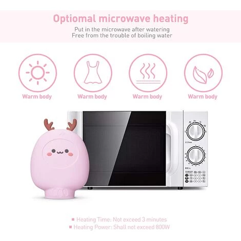 - Chauffage par micro-ondes disponible: le sac d’eau chaude peut être chauffé avec un four à micro-ondes sans avoir à changer d’eau. C’est plus pratique à utiliser (le temps de chauffage est de 2 minutes et la puissance calorifique ne doit pas dépasser 800 W). Remplissez ensuite d’eau froide. Lorsque vous le mettez au réfrigérateur, vous recevez un sac de glace qui peut être utilisé comme compresse chaude pour la douleur, les blessures sportives, les douleurs menstruelles et d’autres douleurs courantes.