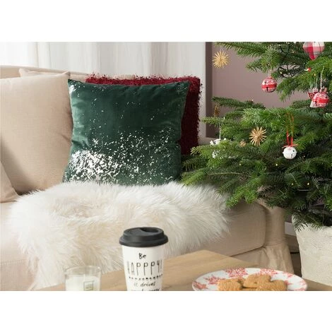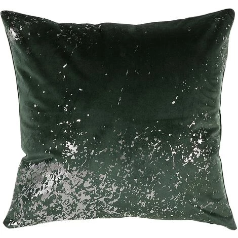 Coussin décoratif en velours vert au motif taches argentées 45 x 45 cm. Ce coussin décoratif est un accessoire idéal pour parfiare le décor de tous les intérieurs, capable d’ajouter beaucoup de caractère à n’importe quelle pièce. Fait en velours vert foncé et doté d’un motif abstrait en forme de taches argentées, ce charmant coussin fera une belle décoration de canapé, de fauteuil ou de lit.