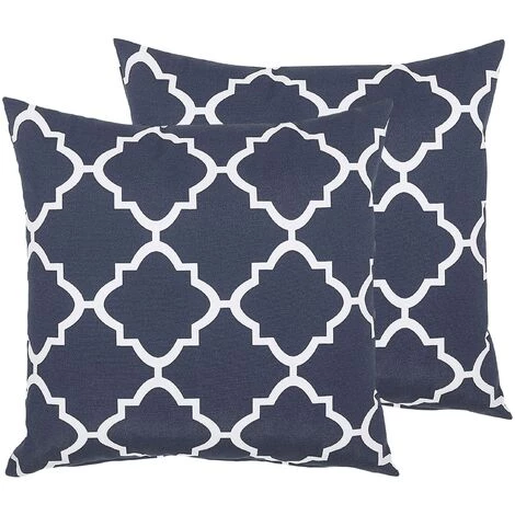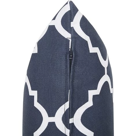 2 coussins déco extérieurs en tissu hydrofuge à motif marocain. Ouvrez votre jardin aux couleurs ! Que se soit pour le soutien supplémentaire de votre dos, pour décorer un banc de jardin ou un canapé d’extérieur ou tout simplement pour y mettre votre tête lors d’un bain de soleil – de jolis coussins – oreillers ne devraient jamais manquer dans le jardin ! Les housses bleu marine à motif marocain blanc ajouteront à votre déco une touche orientale très en vogue, tandis que le tissu résistant aux rayons UV, hydrofuge et anti-salissures assure que le nouveau look de votre espace extérieur reste avec vous pour longtemps. Pour encore plus de confort, les housses de ces charmants coussins de jardin peuvent être retirées via une fermeture éclair dissimulée pour un lavage à la main facile.