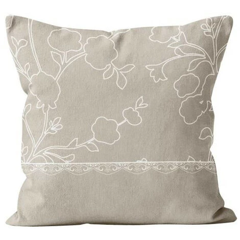 Coussin décoratif déhoussable en pur avec broderie et dentelle, style charme. Couleur: taupe et blanc. Composition: enveloppe: 100 % coton. garnissage: 100 % polyester. Dimension: 40×40 cm.