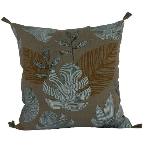 Ambiance naturelle avec ce coussin bi faces à pompons qui égayera votre canapé et renouvelera votre déco. . Le recto de celui-ci est à feuillages avec un verso uni. Double matières avec une face en lin lavé et une autre en coton. Une fermeture en zip vous permet de le déhousser en toute simplicité. Lavage en machine à 30°C. Un édredon assorti est disponible sur notre site. Caractéristiques :. Dimensions : 45 x 45 cm et 50 x 80 cm . Coloris : anthracite, tournesol, navy et cuir. Composition : 1 face : 100% coton et 1 face : 100% lin lavé et garnissage en 100% polyester. Finition : zip. . Vendu à l’unité