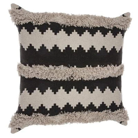 Ambiance Ethnique. Gros coussin de 60 x 60 cm . Impression de motifs ethniques formant de bandes qui sont agrémentées de 3 larges rayures à fourrure. . Des coloris naturels et noirs qui s’intégreront sans difficultés au sein de votre pièce à vivre. Verso uni naturel avec un zip dissimulé sous un rabat pour plus de discrétion. Composition en polyester et coton, ce qui lui confère un toucher agréable. . Déhoussable et lavable en machine en cycle délicat. Il existe également un coussin de sol rond et des plaids assortis. . Caractéristiques :. Dimensions : 60 x 60 cm. Coloris : noir. Composition : polyester et Coton. Finition : déhoussable. . Vendu à l’unité