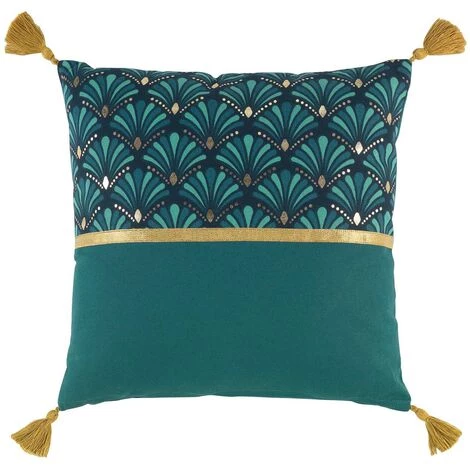 Pour un style vintage, adoptez ce coussin déhoussable art déco de 40 x 40 cm. . La face de ce coussin est composée de deux parties séparées par un ruban doré. . Le dos de ce coussin est uni. . Des pompons dorés viennent ajouter une touche d’originalité à ce coussin. . Celui-ci est déhoussable par un zip. . . Caractéristiques :. Dimensions: 40 x 40 cm. Finition: déhoussable par un zip. Coloris: bleu. Composition: 100% coton et garnissage: 100% polyester. . Vendu à l’unité