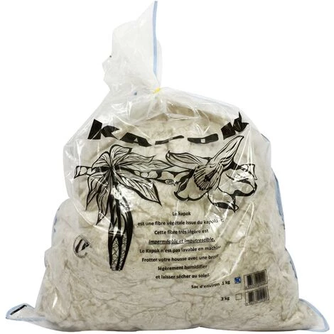 Le kapok est une fibre végétale qui provient des poils fins et soyeux recouvrant les graines du kapokier, elle est à la fois souple, légère et résistante.