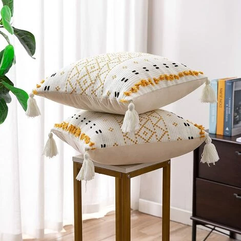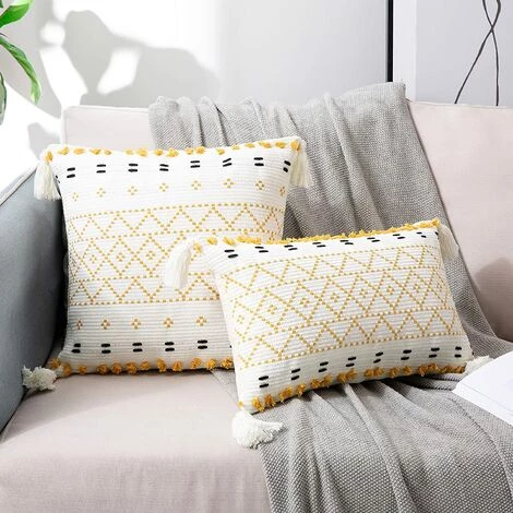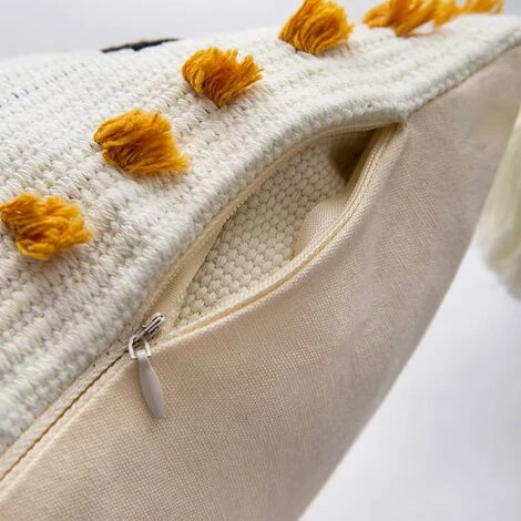 - Housse de coussin : tissage tridimensionnel, motif géométrique, tuiles et pompons. La combinaison de différents éléments est simple et unique, montrant élégance et beauté.