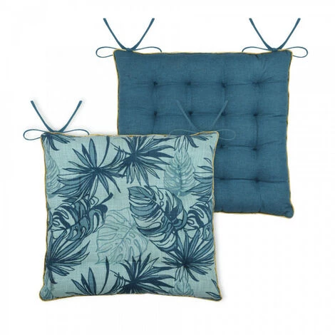Couleur : bleu. Dimensions : environ 40 x 40 cm. Matière : 100 % coton. Finition : non déhoussable. Attaches avec des nouettes. Imprimé : recto motif feuillage verso uni.