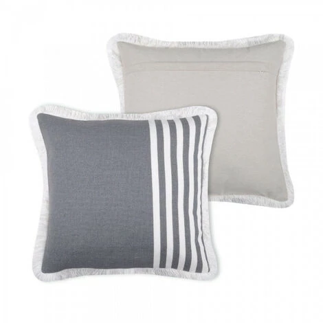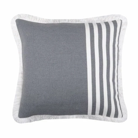 Dimensions : – Longueur : 40 cm.- Largeur : 40 cm. Matière : 100 % coton.Couleur : gris. Finition : à franges. Imprimé : motifs rayures. Une face unie et une face imprimée à motifs. Coussin déhoussable.