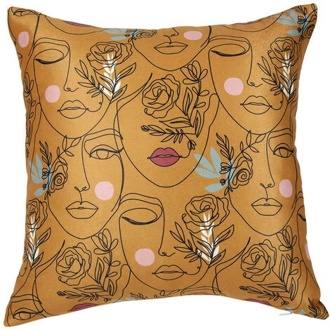 Changez la déco de votre intérieur passe aussi par les petits accessoires comme la housse de coussin Visage moutarde de format carré de dimensions 40×40 cm.