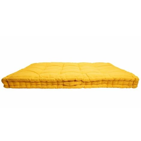 Matelas de sol coussin palette 100% coton 80 x 120 x 8 cm non déhoussable uni jaune. Parfait pour un canapé fabriqué en palettes ou pour s’allonger directement au sol avec sa confortable épaisseur de 8 cm, ce matelas de sol sera votre allié détente et relaxation. Rembourage en fibres naturelles recyclées.