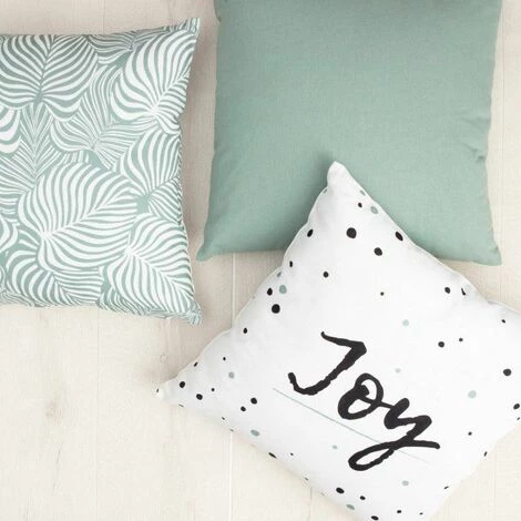 Housse de coussin 100% coton déhoussable avec imprimé Joy tacheté vert et noir sur une face, uni blanc sur l’autre. Une housse de coussin moderne qui apportera comme son imprimé l’indique, de la joie au sein de votre intérieur.