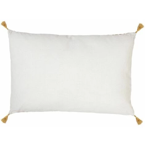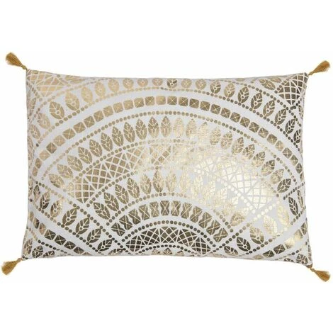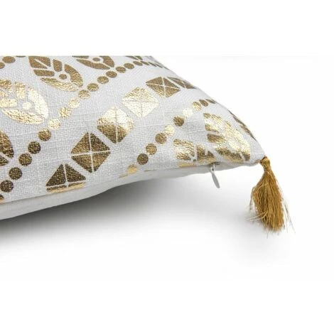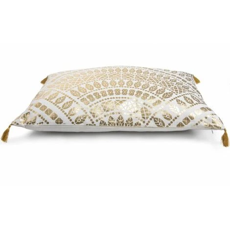 Housse de coussin déhoussable grand format finition quatre pompons avec impression de motifs ethniques or métallisé sur une face, uni écru sur l’autre. Une housse au design chic pour les coussins de votre fauteuil ou canapé.