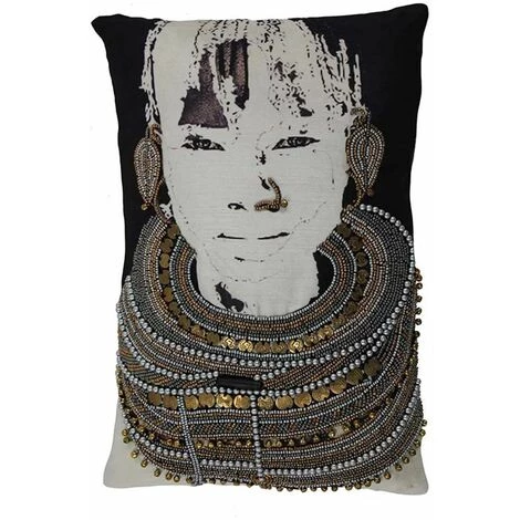 Magnifique coussin, inspiration ethnique chic. Collier de perles rebrodées à la main, un coussin œuvre d’art !