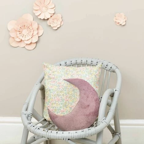 Superbe coussin rose poudré poétique, tout doux, légèrement scintillant, pour jouer et pour rêver. Créez une décoration céleste, douce et imaginaire pour la chambre de votre enfant avec ce coussin en forme de lune, moelleux et confortable.