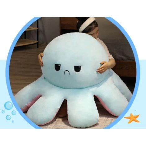 Coussin de pieuvre rose à bleu clair [40 cm] Petit poulpe réversible double face qui change de visage Octopus Happy Angry Coussin en peluche